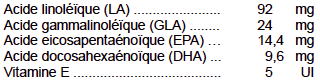 Huiles végétales (bourrache et onagre), Huile de poissons (18/12 EPA/DHA), gélatine, glycérol.