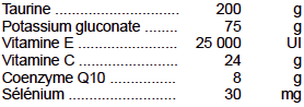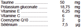 La taurine dont l’apport exogène est particulièrement nécessaire puisque le chat n’en synthétise qu’une trop faible quantité par rapport à ses besoins, associe son action favorable, reconnue sur la fonction cardiaque, à celle du coenzyme Q10.